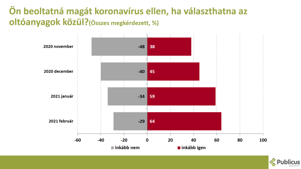 Hónapról hónapra növekszik az oltási hajlandóság: míg 2020 novemberében tízből négy (38 százalék) megkérdezett, addig 2021 februárjában már a válaszadók közel kétharmada (64 százalék) nyilatkozott úgy, hogy beoltatná magát koronavírus ellen, amennyiben választhat az oltóanyagok közül.