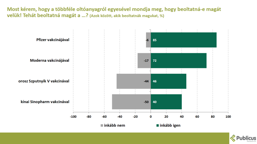 Jóval nagyobb a bizalmatlanság a keleti oltóanyagokkal szemben: akik beoltatnák magukat, azoknak közel a fele fogadná el az orosz vakcinát, illetve tízből négyen a kínai oltóanyagot.