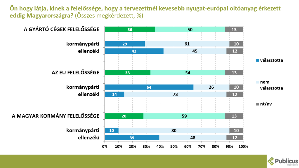 Tízből négy válaszadó szerint a gyártó cégek, a megkérdezettek harmada szerint az Európai Unió, illetve tízből három válaszadó szerint a magyar kormány fellelősége, hogy a tervezettnél kevesebb nyugat-európai oltóanyag érkezett eddig Magyarországra. Az EU fellelőséget leginkább a Fidesz, illetve a magyar kormány fellelőséget leginkább az ellenzék szavazói firtatják.