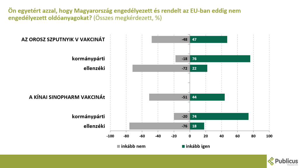 A megkérdezettek közel fele (48 százalék) nem ért egyet azzal, hogy Magyarország engedélyezte és rendelt is az EU-ban eddig még nem engedélyezett orosz Szputnyik V vakcinájából. A Fidesz szavazók háromnegyede (76 százalék) egyetért azzal, hogy hazánk Magyarország engedélyezte és rendelt is az EU-ban eddig még nem engedélyezett orosz készítményből. Az ellenzéki szavazóknak csak az ötöde (22 százalék) nyilatkozott így.