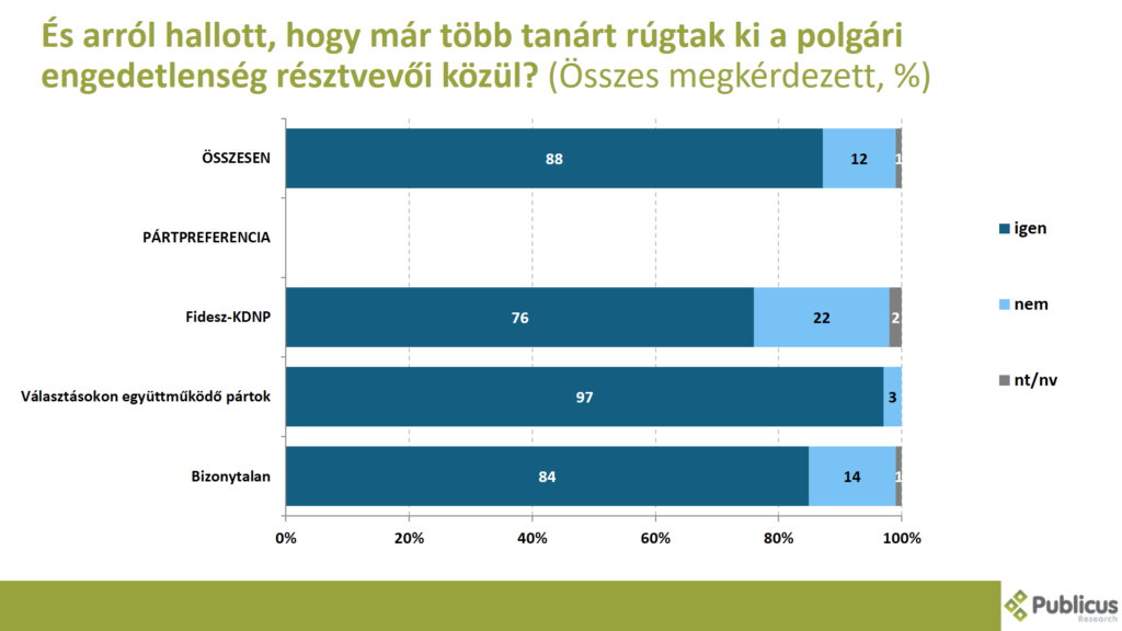 Tízből kilenc (88 százalék) megkérdezett hallott arról, hogy már több tanárt rúgtak ki a polgári engedetlenség résztvevői közül. Ezt mondta a választásokon együttműködő ellenzéki pártok szavazói közül majdnem az összes (97 százalék), a bizonytalan szavazók túlnyomó többsége (84 százalék), illetve a Fidesz szavazók háromnegyede (76 százalék).
