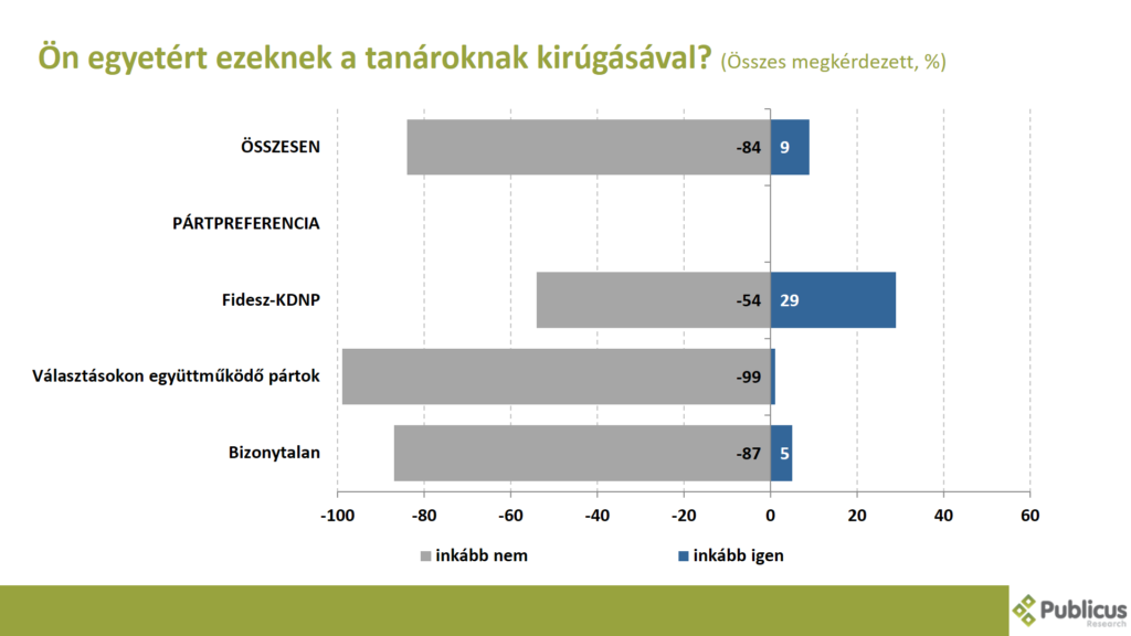 A megkérdezettek túlnyomó többsége (84 százalék) inkább nem ért egyet ezeknek a tanároknak kirúgásával. Így nyilatkozott a választásokon együttműködő ellenzéki pártok szavazói közül majdnem az összes (99 százalék), tízből kilenc (87 százalék) bizonytalan szavazó, illetve a Fidesz szavazók enyhe többsége (54 százalék).