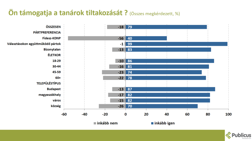 Tízből nyolc (79 százalék) válaszadó támogatja a tanárok tiltakozását. Ezt mondta a választásokon együttműködő ellenzéki pártok szavazói közül majdnem az összes (99 százalék), tízből nyolc (83 százalék) bizonytalan szavazó, illetve tízből négy (40 százalék) Fidesz szavazó.