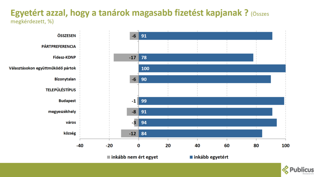 Tízből kilenc (91 százalék) válaszadó inkább egyetért azzal, hogy a tanárok magasabb fizetést kapjanak. Ezt mondta a választásokon együttműködő ellenzéki pártok szavazói közül az összes (100 százalék), tízből kilenc (90 százalék) bizonytalan szavazó, illetve tízből nyolc (78 százalék) Fidesz szavazó. [Októberben még összesen még 89 százalék nyilatkozott így, s mindegyik társadalmi csoportban nőtt az arány]