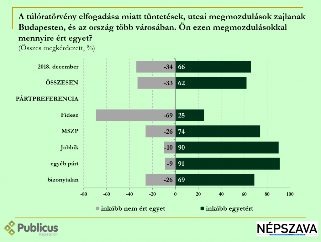 A túlóratörvény elfogadása nyomán kezdődött tiltakozás-hullámmal a megkérdezettek majd’ kétharmada (62 százalék) egyetért, míg harmada (33 százalék) nem ért ezzel egyet. Az egyetértők aránya a múlt hónapban mértekhez képest négy százalékpontot csökkent, azonban ez a változás lényegében kizárólag a Fidesz szavazók véleményének változásából adódik – esetükben 13 százalékponttal csökkent a támogatói arány. Ezt a Jobbik és az egyéb pártok szavazói körében mért 14-15 százalékpontos növekedés sem tudta ellensúlyozni. Továbbra is a Fidesz szavazók az egyetlen társadalmi csoport, amelyik nem ért egyet a megmozdulásokkal.