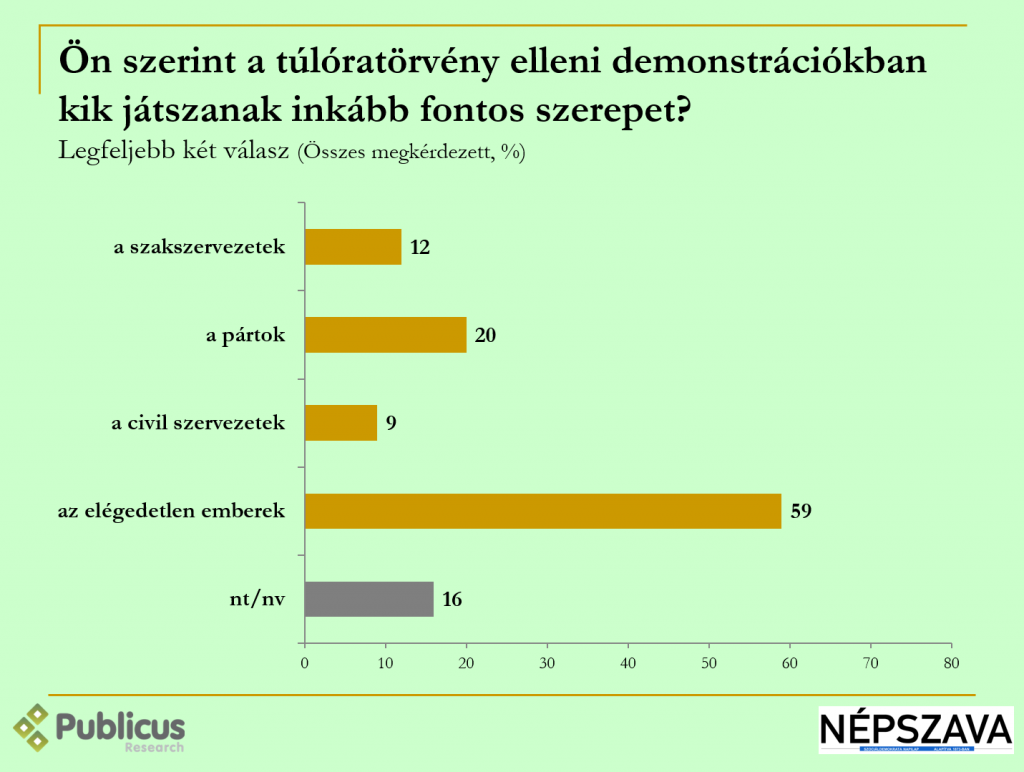 Tíz megkérdezettből hatan (59 százalék) gondolják úgy, hogy az elégedetlen emberek játszanak fontos szerepet az elmúlt időszak demonstrációiban, míg a válaszadók ötöde (20 százalék) a pártokat említette. Tizedük szerint a szakszervezetek (12 százalék), és a civil szervezetek (9 százalék) a meghatározóak.
