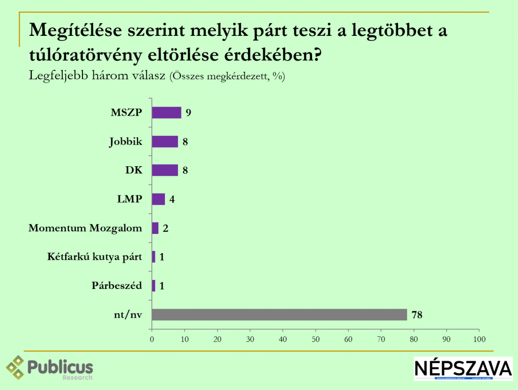 A válaszadók háromnegyede (78 százalék) nem tudott érdemben válaszolni arra a kérdésre, hogy melyik párt teszi a legtöbbet a túlóratörvény eltörlése érdekében. Azonban 9 százalékuk az MSZP-t, 8-8 pedig a Jobbikot és a DK-t említette. 4 százalék szerint az LMP, 2 szerint a Momentum, 1 százalék szerint pedig a Kétfarkú Kutya Párt teszi a legtöbbet.
