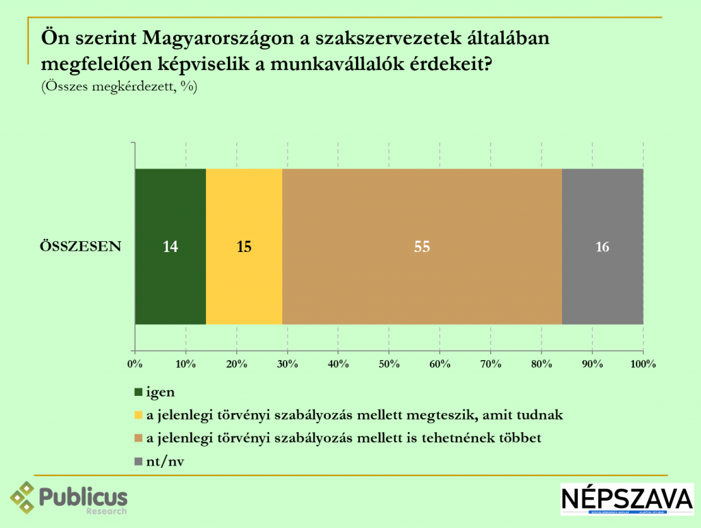 A megkérdezettek több mint fele (55 százalék) szerint a szakszervezetek a jelen törvényi szabályozás mellett is tehetnének többet a munkavállalói érdekek képviseletéért. A válaszadók 14 százaléka szerint minden tőlük telhetőt megtesznek ebben a kérdésben, míg 15 százalék szerint a jelen törvényi szabályozás mellett tesznek meg mindent.