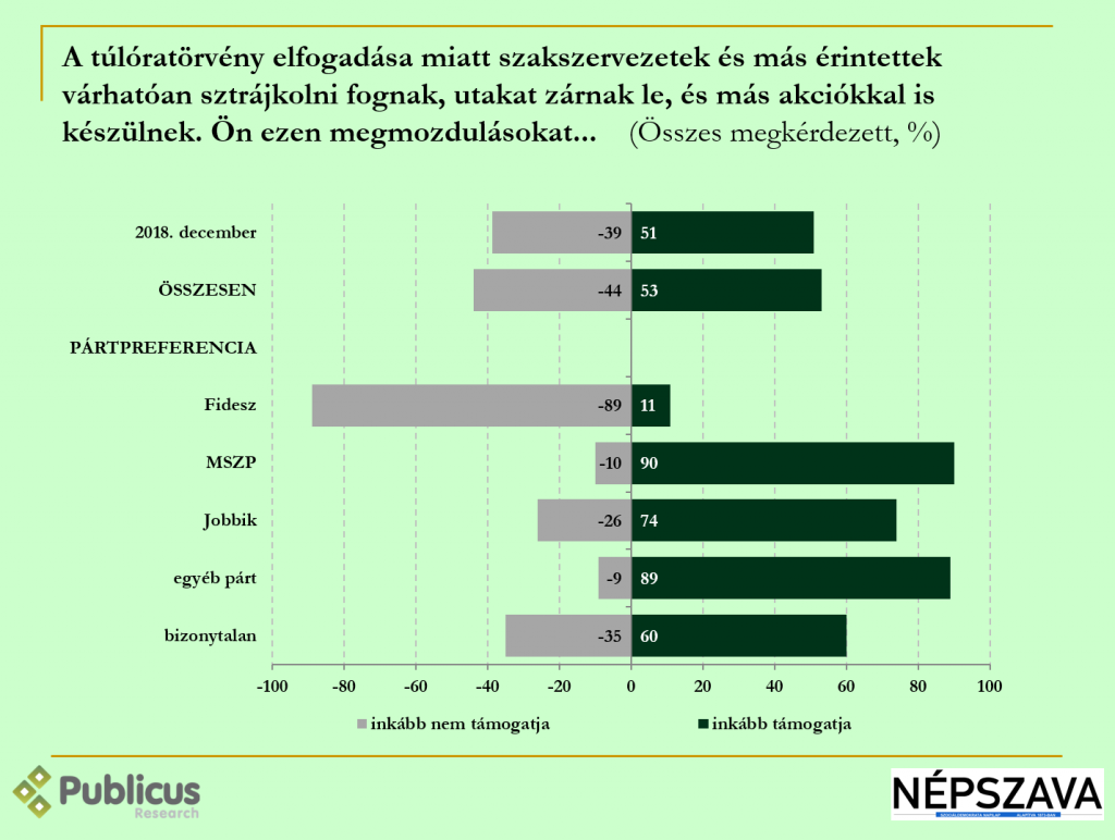 A törvény elfogadása miatt a későbbiekben induló esetleges sztrájkot, útlezáró vagy egyéb akciókat is támogatna a többség (53 százalék). A múlt hónapban mértekhez képest ez két százalékpontos növekedés. Ebben a kérdésben is politikai polarizációt figyelhetünk meg: a Fidesz szavazók körében 20 százalékponttal csökkent a támogatottsága ezen akcióknak, míg az ellenzéki szavazók körében 30, a bizonytalanok esetén 5 százalékponttal növekedett. Ebben az esetben is a Fidesz szavazók az egyetlen társadalmi csoport, amelyik nem ért egyet az esetleges megmozdulásokkal.