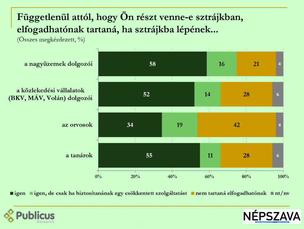 A megkérdezettek háromnegyede (74 százalék) elfogadhatónak tartaná, ha elégséges szolgáltatás mellett sztrájkba lépnek a nagyüzemek dolgozói, kétharmaduk (66 százalék), ha a tanárok, és a közlekedési dolgozók, míg felük (53 százalék) ha az orvosok, egészségügyi dolgozók.