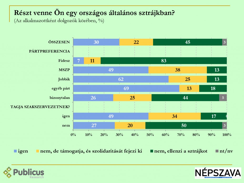 Mindazonáltal tíz alkalmazottként dolgozóból hárman (30 százalék) azt mondták, hogy részt vennének egy általános sztrájkban, míg ketten (22 százalék) nem vennének részt, de támogatják és szolidaritásukat fejezik ki; 45 százalék pedig ellenzi a sztrájkot. Az ellenzők a Fidesz szavazók és a bizonytalanok körében vannak többségben (83 és 44 százalék). Míg az ellenzéki pártok szavazó közel 90 százaléka részt venne, vagy támogatná.