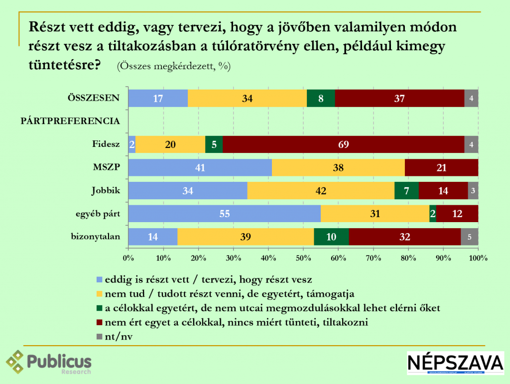 A megkérdezettek 17 százaléka említette azt, hogy már volt, vagy tervezi, hogy személyesen is részt vesz a túlóratörvény elleni tiltakozásban. Míg kétszer ennyien (34 százalék) mondták, hogy nem, de egyetértenek vele, támogatják. 8 százalék a célokkal egyetért, de az utcai megmozdulásokat nem tartja célravezetőnek, míg a válaszadók harmada (37 százalék) szerint nincs miért tüntetni.
