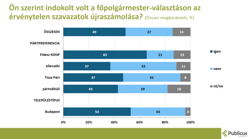 Majdnem minden második (49 százalék) válaszadó szerint indokolt volt a főpolgármester-választáson az érvénytelen szavazatok újraszámolása. Így nyilatkozott a Fidesz szavazók kétharmada (65 százalék), a Tisza Párt szavazónak közel fele (47 százalék). a pártnélküliek 43 százaléka, illetve az ellenzéki szavazók 37 százaléka.