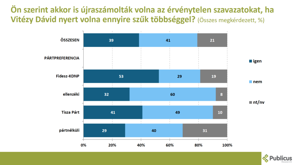 Tízből négy (41 százalék) válaszadó szerint nem számolták volna újra az érvénytelen szavazatokat abban az esetben, ha Vitézy Dávid nyert volna ennyire szűk többséggel. Így gondolja tízből hat (60 százalék) ellenzéki szavazó, a Tisza Párt szavazói közül minden második (49 százalék), tízből négy (29 százalék) pártnélküli szavazó, illetve tízből három (29 százalék) Fidesz szavazó.