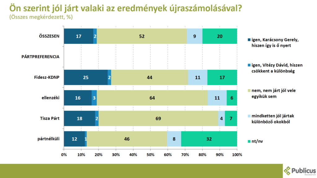 A megkérdezettek 17 százaléka szerint Karácsony járt jól a szavazatok újraszámolásával, hiszen így is ő nyert. Ezt mondta a Fidesz szavazók negyede (25 százalék), a Tisza Párt szavazóinak a 18 százaléka, az ellenzéki szavazók 16 százaléka, illetve a pártnélküliek 12 százaléka.