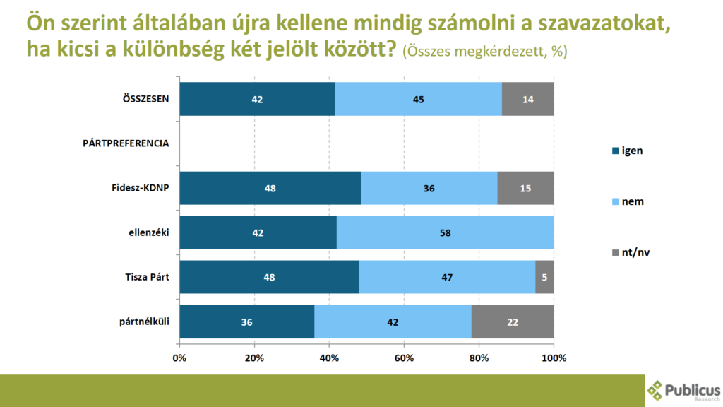 A válaszadók 42 százaléka szerint általában újra kellene mindig számolni a szavazatokat, ha kicsi a különbség két jelölt között. Így gondolja a Fidesz szavazók 48 százaléka, a Tisza Párt szavazóinak szintén 48 százaléka, az ellenzéki szavazók 42 százaléka, illetve a pártnélküliek 36 százaléka.