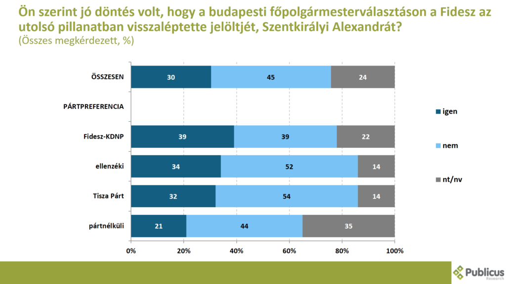 A válaszadók 45 százaléka szerint nem volt jó döntés, hogy a budapesti főpolgármesterválasztáson a Fidesz az utolsó pillanatban visszaléptette jelöltjét, Szentkirályi Alexandrát. Így gondolja a Tisza Párt szavazóinak 54 százaléka, az ellenzéki szavazók 52 százalék, a pártnélküliek 44 százaléka, illetve a Fidesz szavazók 39 százaléka.