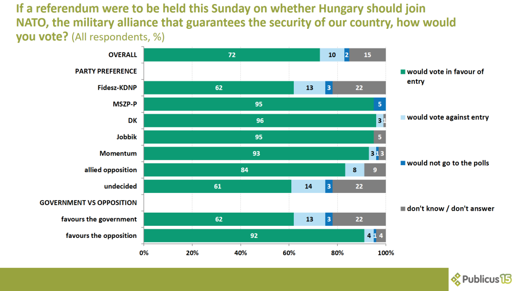 14 percent of undecided voters, 13 percent of Fidesz voters, and 4 percent of opposition voters would vote against Hungary’s NATO membership. 3 percent of both pro-government and undecided voters and 1 percent of opposition voters would not go to the polls.
