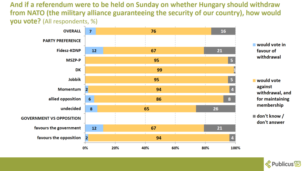 If a referendum were to be held this Sunday on whether Hungary should withdraw from NATO, three-quarters (76 percent) of the respondents would vote against withdrawal, and for maintaining membership. Almost all opposition voters (94 percent) and nearly two-thirds of Fidesz voters and insecure voters (67 and 65 percent) said the same.