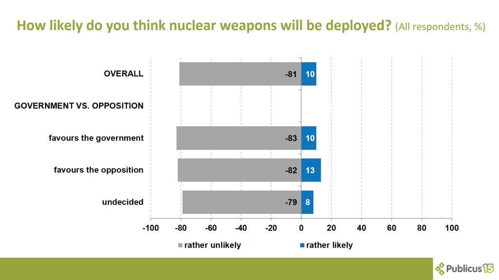 10 percent of respondents believe it is rather likely that nuclear weapons will be deployed during the war – 13 percent of opposition voters, 10 percent of Fidesz voters and 8 percent of undecided voters think so.