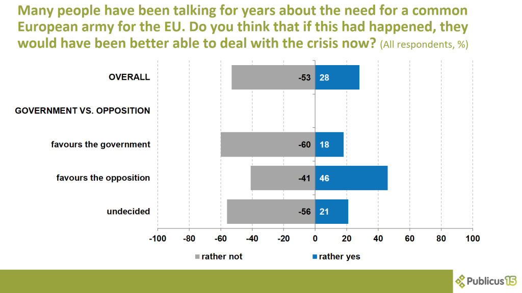 Many people have been talking for years about the need for a common European army for the European Union. Three in ten (28 percent) respondents say that if it had happened, the EU would have been better able to deal with the crisis. This opinion is shared by nearly half of the opposition voters (46 percent) and almost a fifth of undecided voters as well as Fidesz voters (21 and 18 percent).