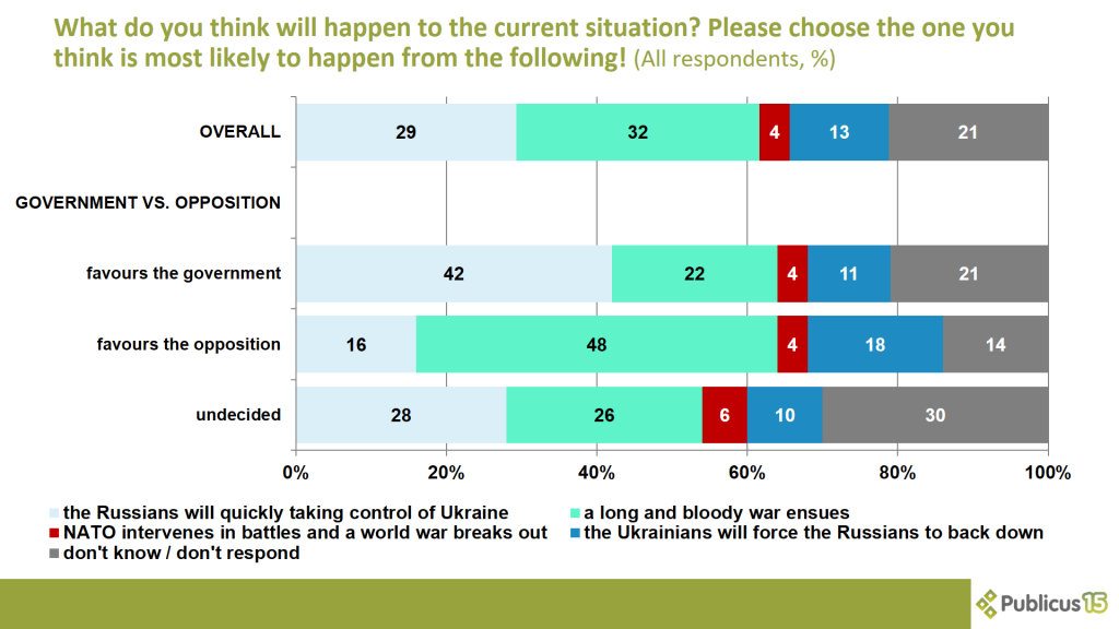 A third of respondents think a long and bloody war is most likely to ensue. Half of opposition voters, a quarter of undecided voters and a fifth of Fidesz voters agree.