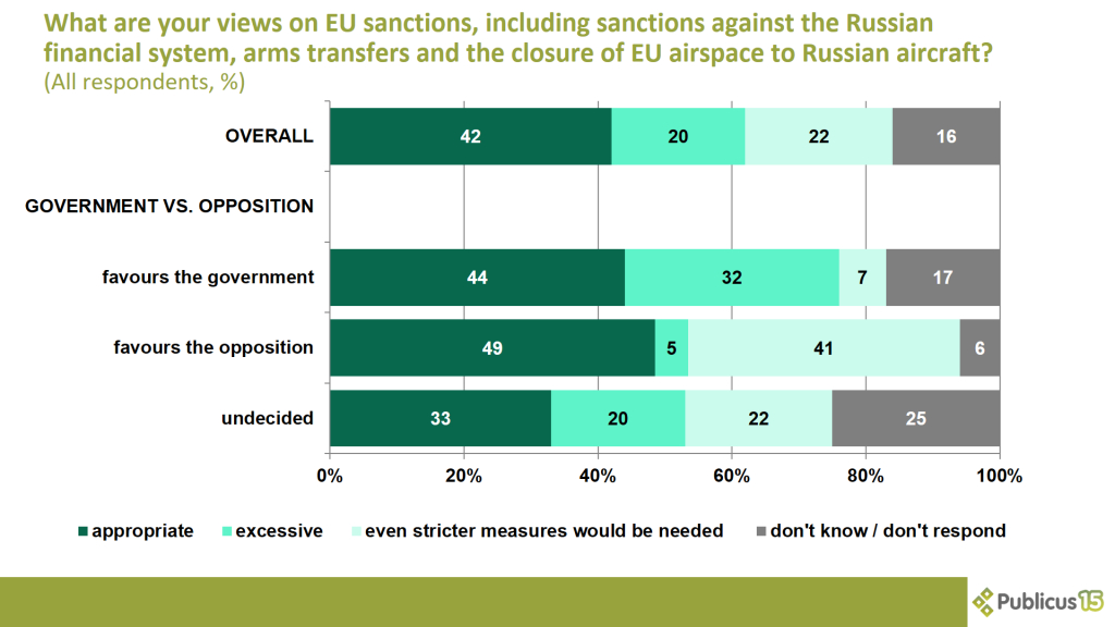 Four out of ten respondents (42 percent) say EU sanctions against Russia are appropriate, including sanctions against the Russian financial system, arms transfers and the closure of EU airspace to Russian aircraft. This view is shared by every other (49 percent) opposition voter, 44 percent of Fidesz voters and 33 percent of undecided voters.