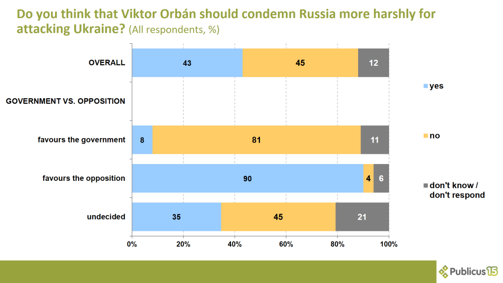 According to 43 percent of respondents, Viktor Orbán should condemn Russia more harshly for attacking Ukraine. However, 45 percent say the prime minister should not do so.