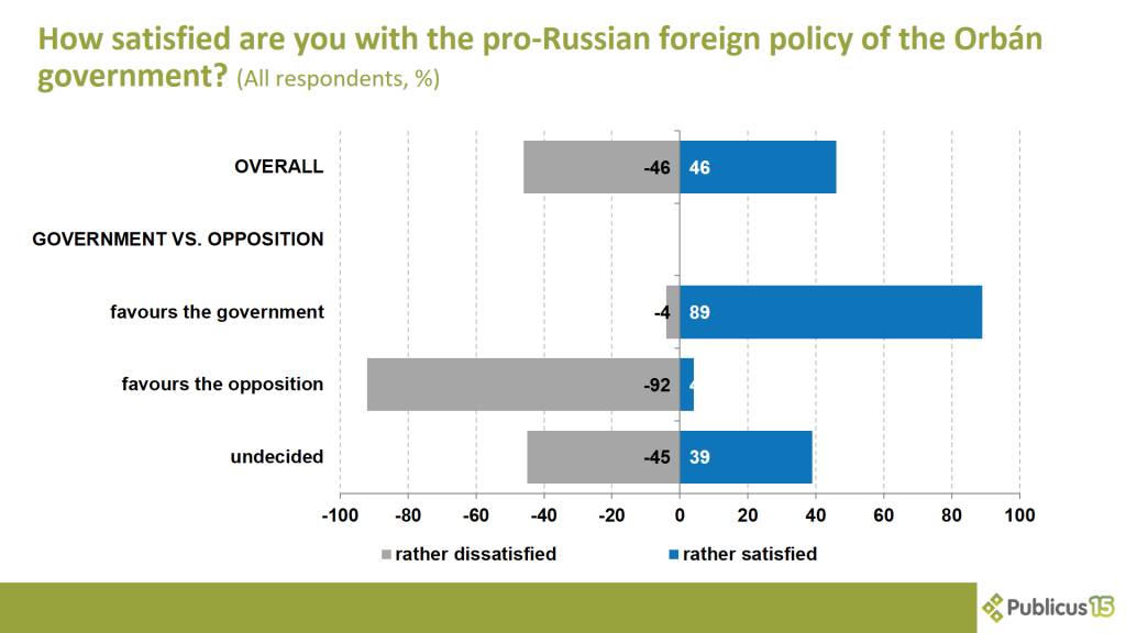 Nearly every other respondent (46 percent) is rather satisfied while the other half (46 percent) is rather dissatisfied with the pro-Russian foreign policy of the Orbán government. While Fidesz voters are rather satisfied (89 percent), opposition voters are rather dissatisfied (92 percent) with Hungarian foreign policy actions. Undecided voters tend to be rather dissatisfied with pro-Russian policies (45 vs. 39 percent).