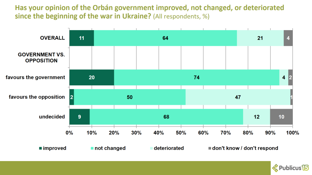 One in five (21 percent) respondents say their views have deteriorated on the Orbán government since the beginning of the war in Ukraine. This is said by nearly one in two (47 percent) opposition voters, 12 percent of undecided voters and 4 percent of Fidesz voters.