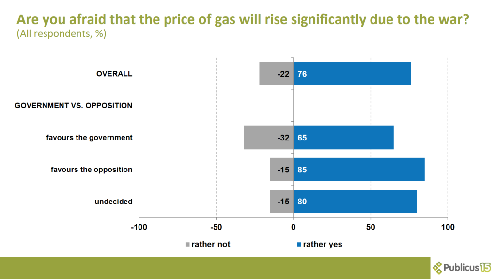 Three-quarters of respondents (76 percent) are rather afraid of a significant rise in gas prices due to the war. This opinion is shared by 85 percent of opposition voters, 80 percent of undecided voters and 65 percent of Fidesz voters.