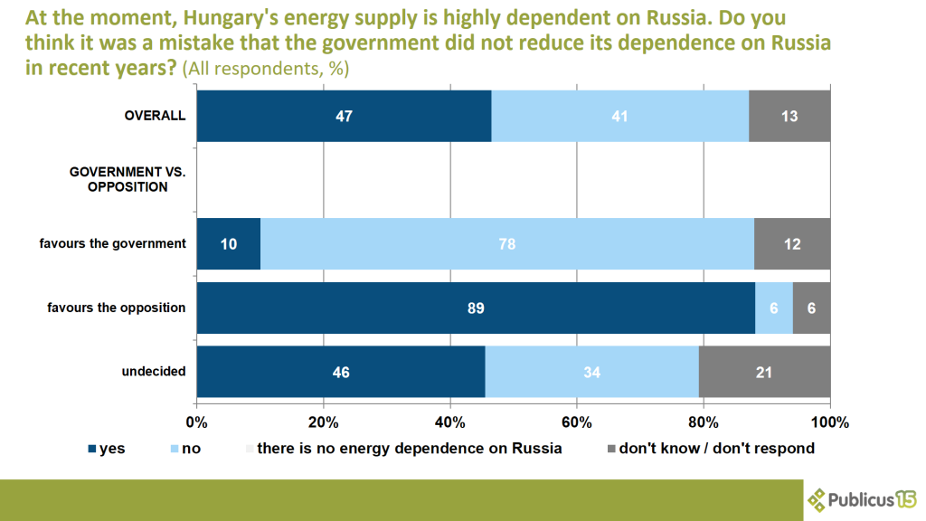 At the moment, Hungary’s energy supply is highly dependent on Russia. One in two (47 percent) respondents say it was a mistake that the government had not reduced its dependence on Russia in recent years. Nine out of ten (89 percent) opposition voters, almost every other (46 percent) undecided voters and one in ten (10 percent) Fidesz voters share this opinion.
