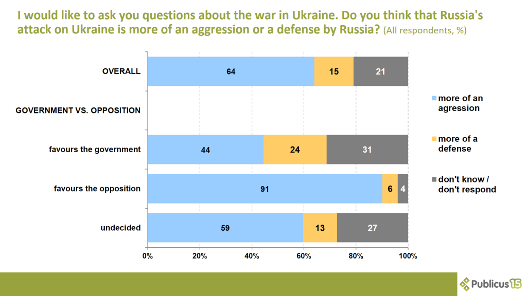 Two-thirds of respondents (64 percent) say Russia’s invasion of Ukraine was more of an aggression than a defense by Russia – nine out of ten (91 percent) opposition voters, six out of ten (59 percent) undecided voters and 44 percent of Fidesz voters think so.