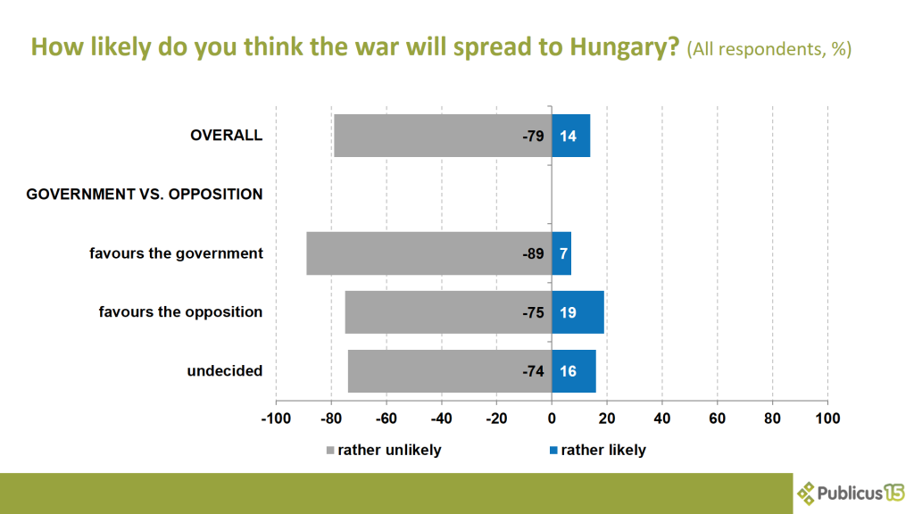 According to 14 percent of the respondents, it is rather likely that the war will spread to Hungary. A fifth of opposition voters (19 percent), 16 percent of undecided voters and 7 percent of Fidesz voters agree with this.