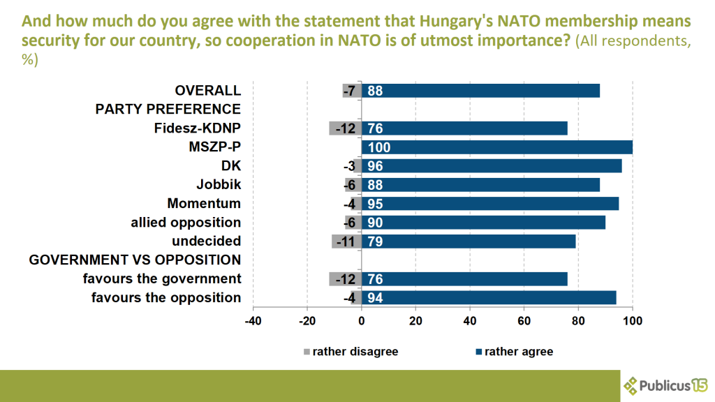 Nine out of ten respondents (88 percent) rather agree with the statement that Hungary’s NATO membership means security for Hungary, therefore cooperation in NATO is of utmost importance. 94 percent of opposition voters, 79 percent of undecided voters, and 76 percent of Fidesz voters think so.