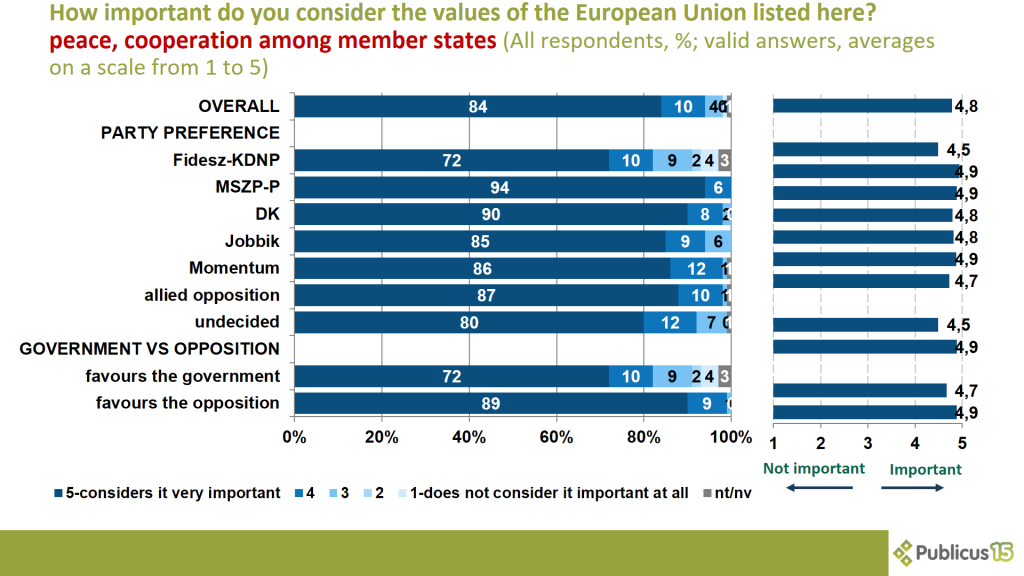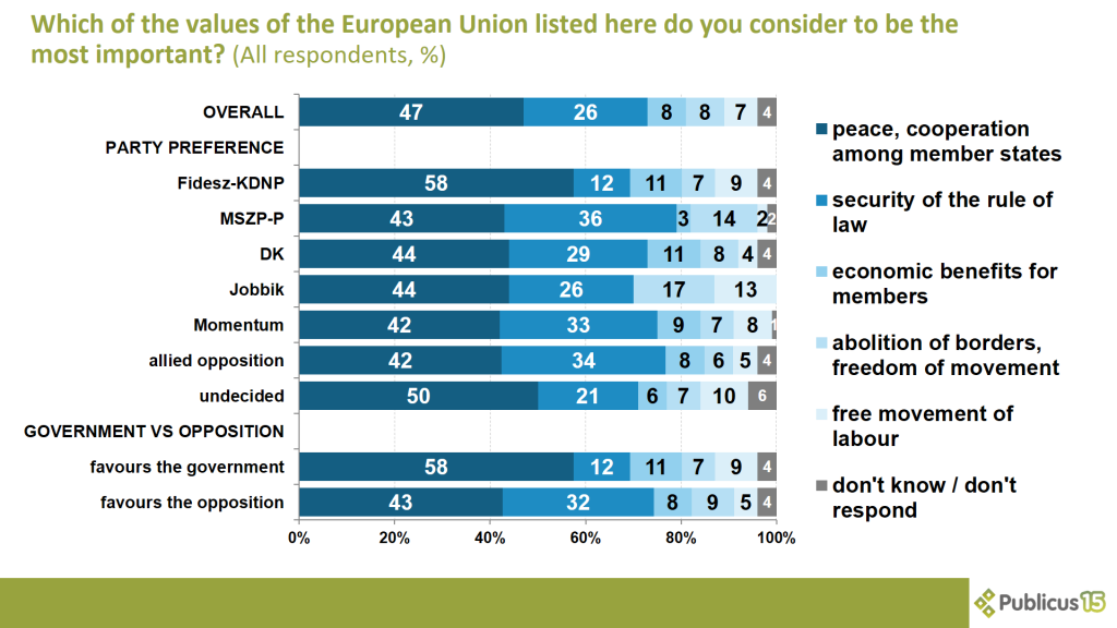 Fidesz voters and undecided voters (58 and 50 percent) see peace and cooperation as the EU’s most important value. And the security of the rule of law is most emphasized by opposition voters (32 percent).