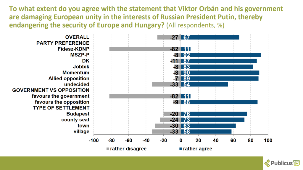 Two-thirds of respondents rather agree with the statement that Viktor Orbán and his government are damaging European unity in the interests of Russian President Putin, thereby endangering the security of Europe and Hungary.