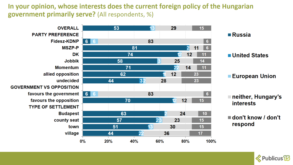 According to seven out of ten (70 percent) opposition voters, 44 percent of undecided voters and 6 percent of Fidesz voters, the current foreign policy of the Hungarian government primarily serves Russia’s interests.