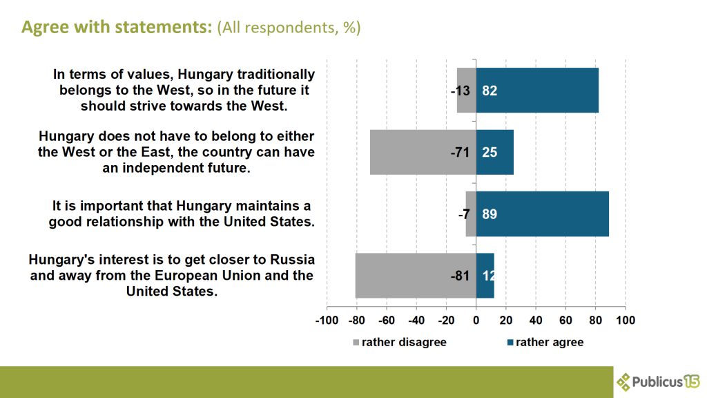 Eight out of ten respondents (81 percent) rather disagree that it is in Hungary’s interest to get closer to Russia and away from the European Union and the United States.
