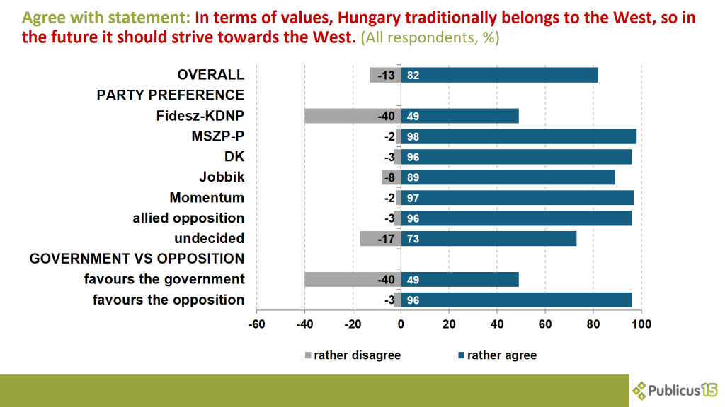 According to 96 percent of the opposition voters, 73 percent of the undecided voters and 49 percent of the Fidesz voters, in terms of values, Hungary traditionally belongs to the West, so in the future it should strive towards the West. At the same time, however, 40 percent of pro-government voters and 17 percent of undecided voters rather disagree with this statement.