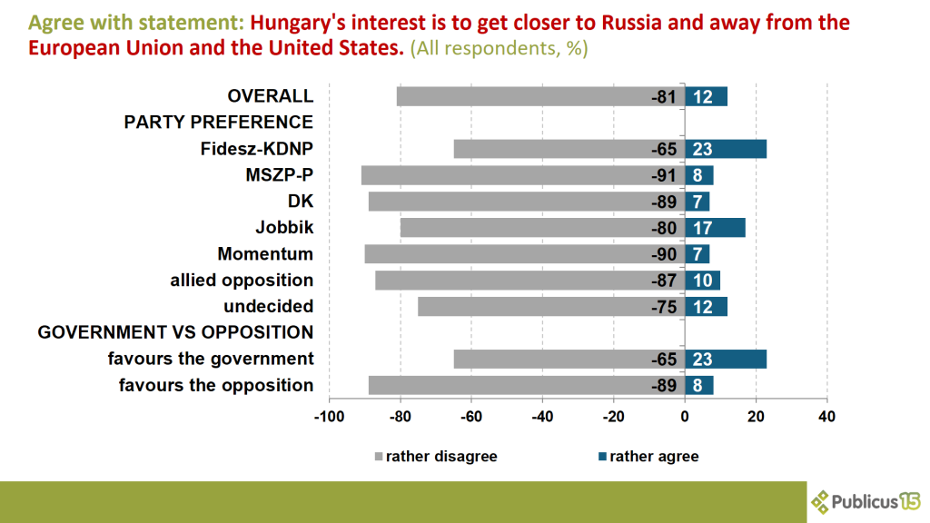 Nine out of ten (89 percent) opposition voters, three-quarters (75 percent) of undecided voters and two-thirds (65 percent) of Fidesz voters rather disagree with the statement that it is in Hungary’s interest to move closer to Russia and away from the European Union and the United States.