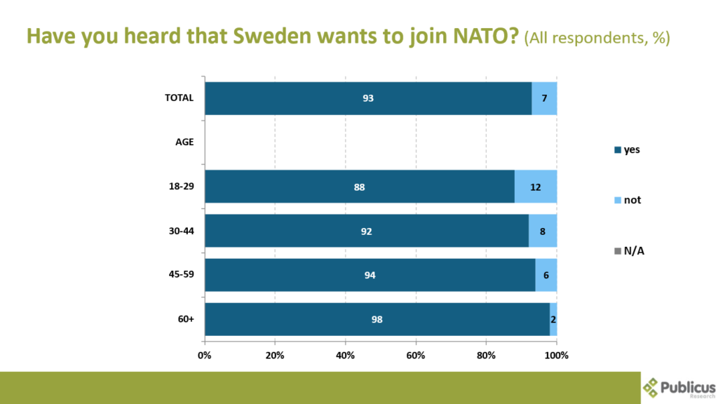 Nine in ten (93%) of those surveyed had heard that Sweden wants to join NATO. The older someone was, the more likely they were to have heard about it: 88 percent of 18-29 year olds and 98 per cent of those aged 60 and over said they had heard the news.