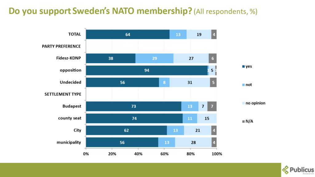 Two thirds of respondents (64%) support Sweden’s NATO membership. This was the opinion of almost all (94%) of the voters of the opposition parties that cooperated in the elections, nearly six in ten (56%) of the undecided voters and four in ten (38%) of Fidesz voters.