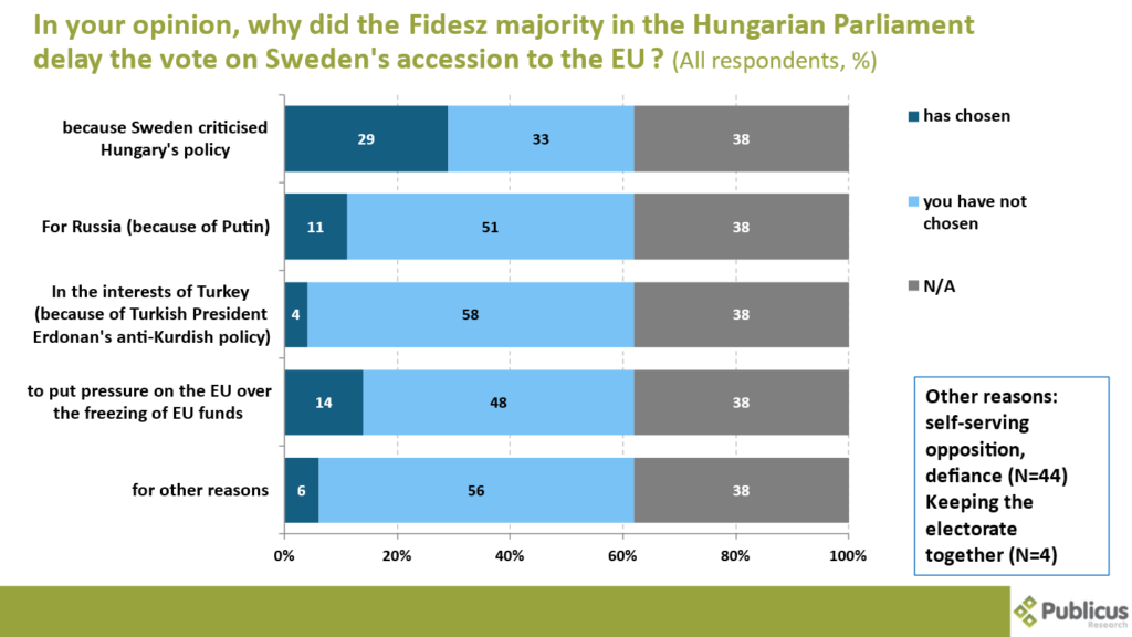 Three in ten (29%) of respondents believe that the Fidesz majority in the Hungarian parliament is delaying Sweden’s accession to NATO because the Scandinavian state has criticised Hungary’s politics.
