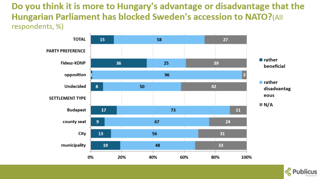 Six in ten (58%) of those polled said that it is rather disadvantageous for Hungary that the Hungarian parliament is blocking Sweden’s accession to NATO. This was the opinion of almost all (96%) of the voters of the opposition parties who co-operated in the elections, of every second (50%) undecided voter and of a quarter (25%) of Fidesz voters.