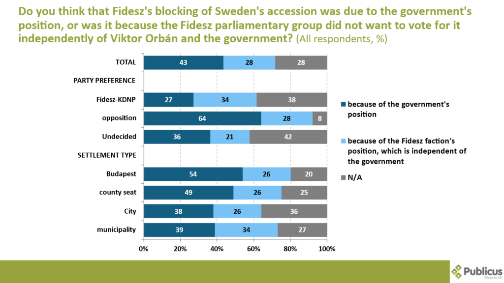 Four out of ten (43%) respondents said that Fidesz’s obstruction of Sweden’s accession to NATO is due to the government’s stance. This is the view of two-thirds (64 percent) of voters from the opposition parties that co-operated in the elections, nearly four in ten (36 percent) undecided voters and nearly three in ten (27 percent) Fidesz voters.