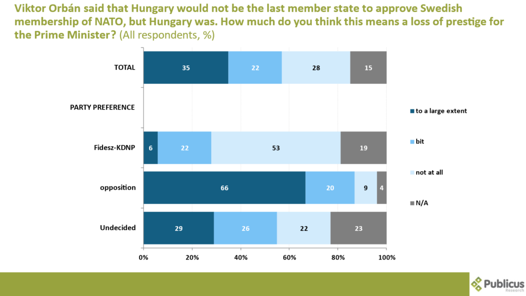 Viktor Orbán said that Hungary would not be the last member state to approve Swedish membership of NATO, yet Hungary is. A third of respondents (35 percent) said this was a major loss of prestige for the prime minister. Two thirds (64 percent) of the voters of the opposition parties that cooperated in the elections, three in ten (30 percent) undecided voters and 6 percent of Fidesz voters think so.
