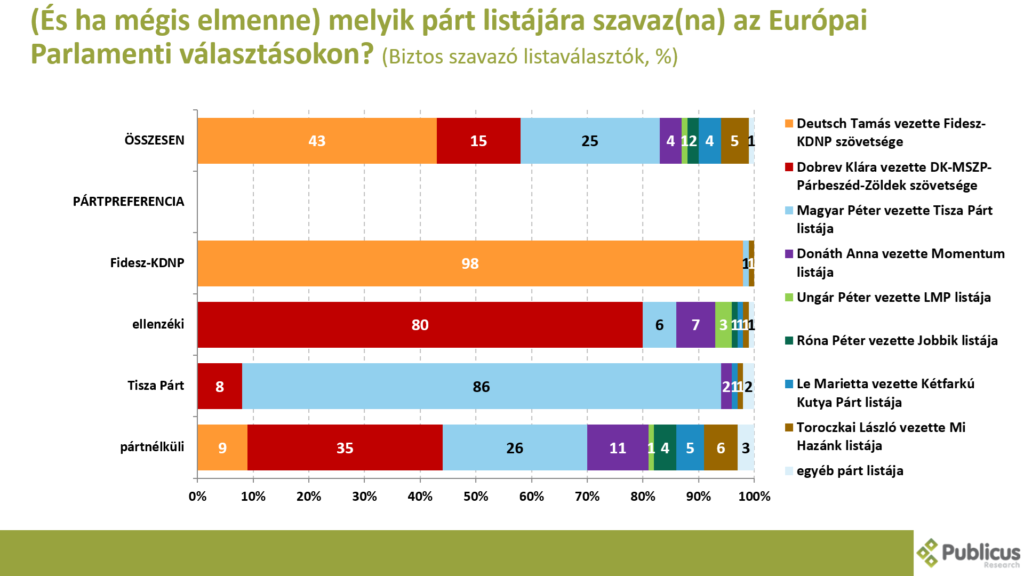 A Publicus Intézet a 2024. június 3 – 5. között 1001 fő választókorú megkérdezésével készített és június 7-én nyilvánosságra hozott reprezentatív kutatása azt vizsgálta, hogy a magyarok szavaznának a 2024. június 9-i Európai Parlamenti választásokon.