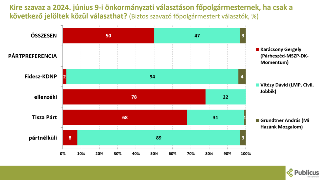 A Publicus Intézet a 2024. június 4 – 6. között 1042 fő budapesti megkérdezésével készített és június 8-án nyilvánosságra hozott reprezentatív közvéleménykutatása azt vizsgálta, hogy a fővárosiak kire szavaznának a 2024. június 9-i önkormányzati választáson.